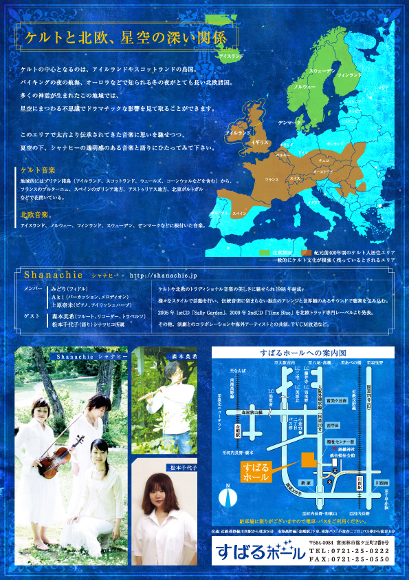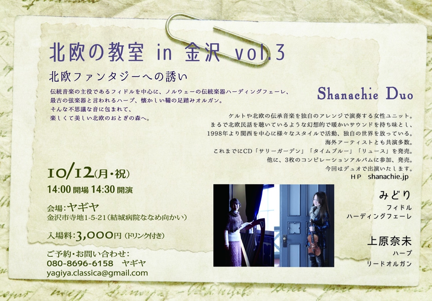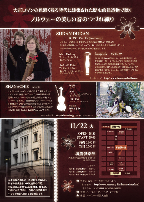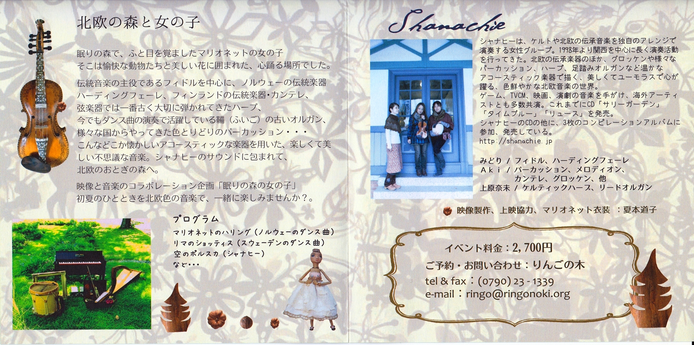 | 10月 | Shanachie&Annikor 北欧の音楽祭@郷の音ホール 会場:兵庫県三田市 三田市総合文化センター 郷の音ホール ちらし 表 裏 |