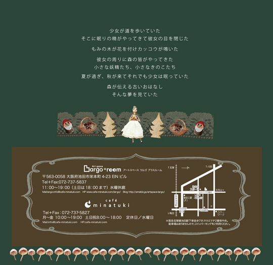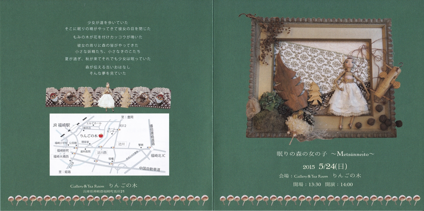 | 11月 | Concert & Exhibition 眠りの森の女の子~Metsänneito~ Shanachie+Bouton(フラワー)+Atelier la Lusiole(北欧雑貨・演出)によるコンサート&展覧会 会場:Art space Largo+room ちらし 表 中 裏 |