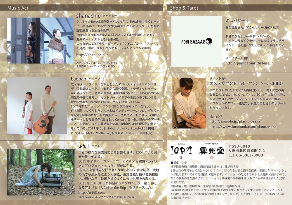 | 9月 | Shanachie&Annikor 夢見る森の音語り@time blue 会場:大阪市北区 time blue ちらし |