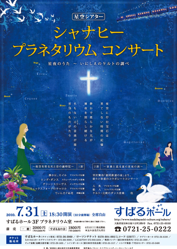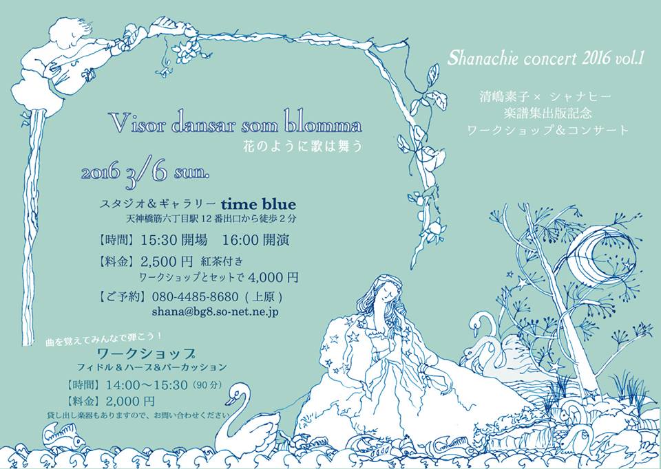 | ザ・フェニックスホール エヴォリューションシリーズvol.47 「青の時間」~シャナヒーが伝えるトラディショナル・フォークの世界~ 開催 会場:ザ・フェニックスホール 主催:シャナヒー 共催:ザ・フェニックスホール 協賛:ニッセイ同和損保 後援:ノルウェー王国大使館・スウェーデン大使館・アイルランド大使館 協力:HarmonyFields・Recording Studio NMG フライヤー おもて うら |