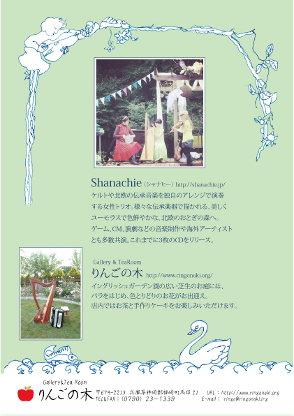 | 5月 | shanachie Live@りんごの木 会場:兵庫県福崎町 Gallery&Tea Room りんごの木 ちらし 表 裏 |