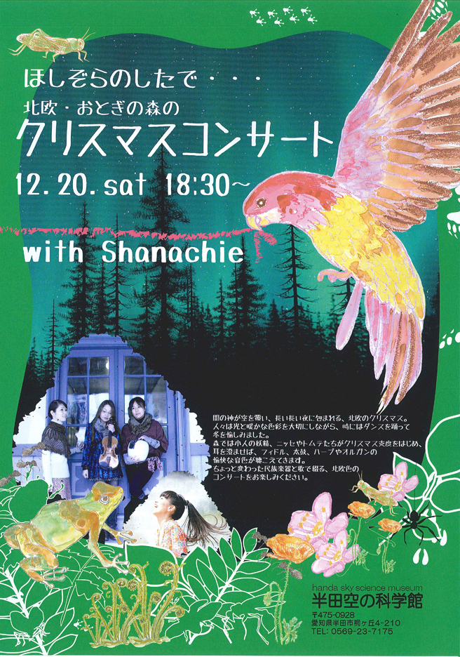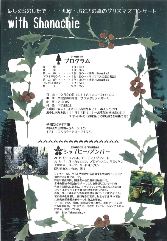 | ほしぞらの下で・・・北欧・おとぎの森のクリスマスコンサート 会場:愛知県半田市 半田の空科学館 プラネタリウムホール with ほりおみわさん ちらし表 裏 |