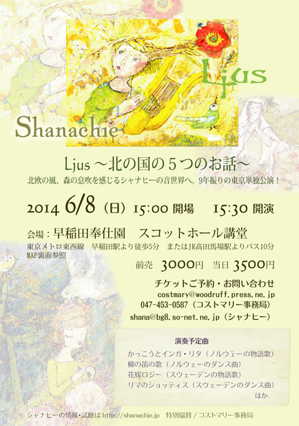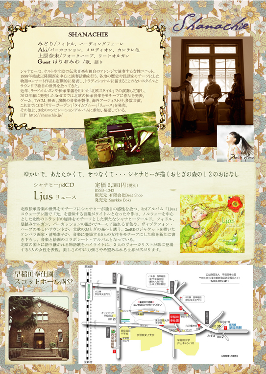 | 東京公演「Ljus〜北の国の5つのお話〜」 会場:早稲田奉仕園 スコットホール講堂 主催:シャナヒー 特別協賛:コストマリー事務局 ちらし表 裏 |